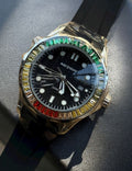 A stunning circle of colorful rainbow stones surrounds the dial, creating a dazzling and unique look that catches the light from every angle.