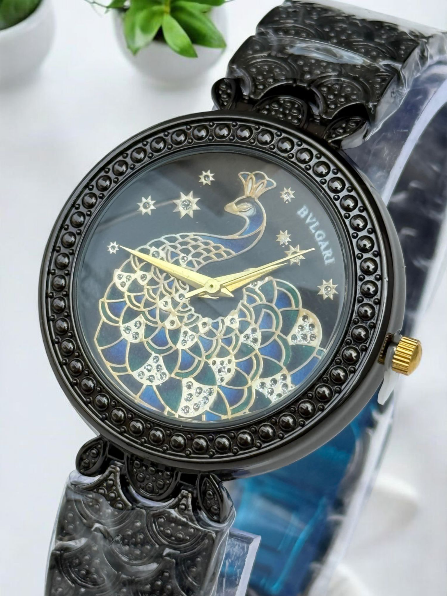 Bvlgari Ladies Watch – Stainless Steel with Peacock Engraved Dial